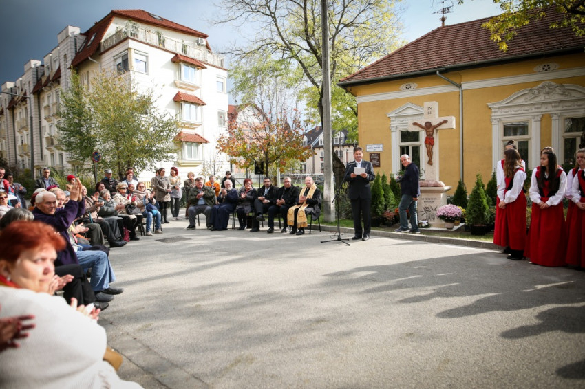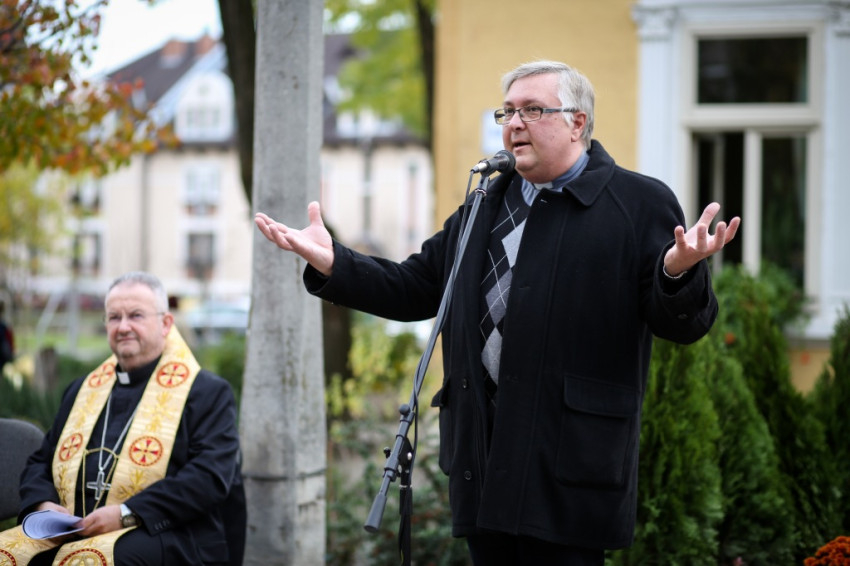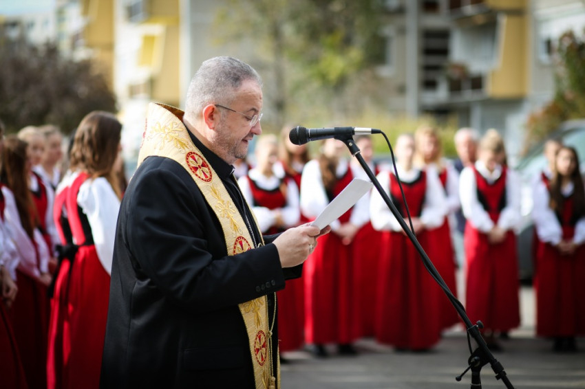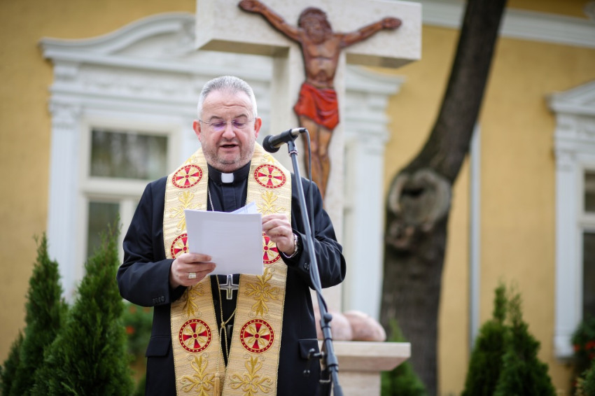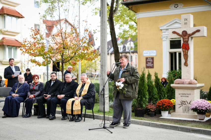 „Ősz elején a szegényekre való odafigyelés rendezvénysorozatát hirdette meg a Karol Wojtyła Barátság Központ azzal a céllal, hogy felhívjuk a figyelmet az elesettekre, segítsük őket a magunk eszközeivel – mondta köszöntő beszédében Molnár Zoltán intézményvezető. – Szeptemberben jótékonysági előadást rendeztünk a kecskeméti ferences templomban, ahol a város fúvós együttesei adtak koncertet. Most keresztet állítottunk, a Szegények Kenyere keresztjét. Jézus kétezer éve tanúskodik a keresztfán, és hirdeti: »Ne féljetek azoktól, akik megölik a testet, mert a lelket nem tudják megölni.« Tanúskodik az igazságról, mert az igazság szabaddá tesz. Jézus igazsága maga a szeretet, a megkülönböztetés nélküli. A kereszt üzenete ennyi: szeressétek egymást!”