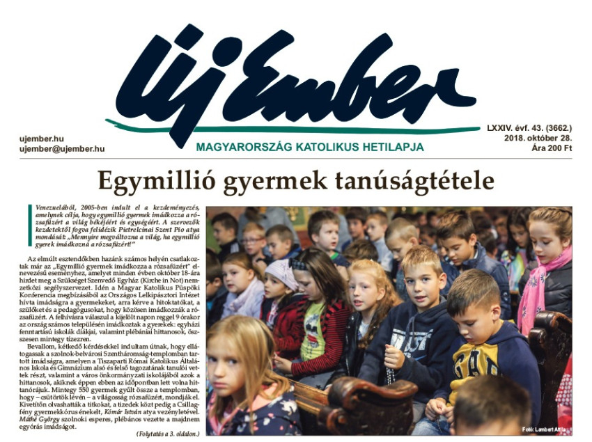 A címoldalon adunk hírt egy kezdeményezésről, amely Venezuelából, 2005-ben indult, s az a célja, hogy egy adott napon világszerte egymillió gyermek imádkozza a rózsafüzért a világ békéjéért és egységéért. A szolnok-belvárosi Szentháromság-templomban a Tiszaparti Római Katolikus Általános Iskola és Gimnázium alsó és felső tagozatának tanulói vettek részt az imában, valamint a város önkormányzati iskolájából azok a hittanosok, akiknek éppen ebben az időpontban lett volna hittanórájuk. Mintegy 550 gyermek gyűlt össze.