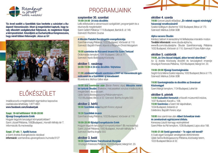– A Nemzetközi Eucharisztikus Kongresszus első előkészületi évében arra lettünk meghívva, hogy egyénileg mélyítsük el kapcsolatunkat hitünk nagy kincsével, az Eucharisztia misztériumával. Ezért programjainkban jelentősen kiemelkednek a szentségimádási órák és a szentmise. Szeretnénk tovább erősödni a hitben, a Jézus Krisztushoz fűződő kapcsolatunkban. Ha már megerősödött a tűz bennünk, akkor indulunk el, hogy megszólítsuk a környezetünket. A missziós menet ennek egyik kifejezése, imáinkkal megszenteljük, énekünkkel Jézushoz hívjuk a környezetünkben élőket. Viszünk magunkkal igekártyákat, és odaadjuk a közelünkben állóknak. Akár a környező éttermekbe, sörözőkbe is betérhetünk, ugyanezzel a céllal, biztatni, reményt adni az embereknek.