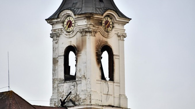 A tűz károsította a teljes harangtornyot – a torony fafödémeit, a harangtartó állványt, a torony nyílászáróit –, sőt a harangok is használhatatlanná váltak. A torony tűzeset során károsodott szerkezeti elemeinek és a sérült harangoknak az eltávolítása balesetveszély miatt elengedhetetlen volt.