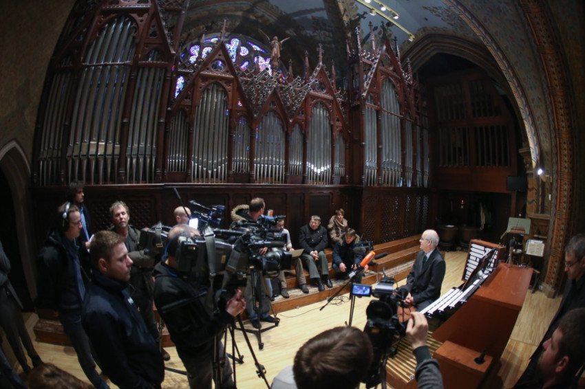 Hock Bertalan orgonaművész mutatta be a sajtó képviselőinek a megújult hangszert. Elmondta, hogy az orgona szekrénye már 1893-ban elkészült Schulek Frigyes tervei alapján, azonban a benne elhelyezett hangszer nem felelt meg a templom egyházzenei igényeinek. 1909-ben készült el Rieger Ottó budapesti gyárában a „királyi orgona” abból az 50 000 koronából, amelyet Ferenc József adományozott koronázásának negyvenedik évfordulója alkalmából. A hangszert azóta többször átépítették. Az 1931-es felújítást követően a második világháború alatt súlyosan megsérült, 1947-ben megjavították. Teljes felújításra azonban ekkor nem került sor, ez csak 1983–84-ben vált lehetővé a csehországi Rieger-Kloss orgonagyárban.