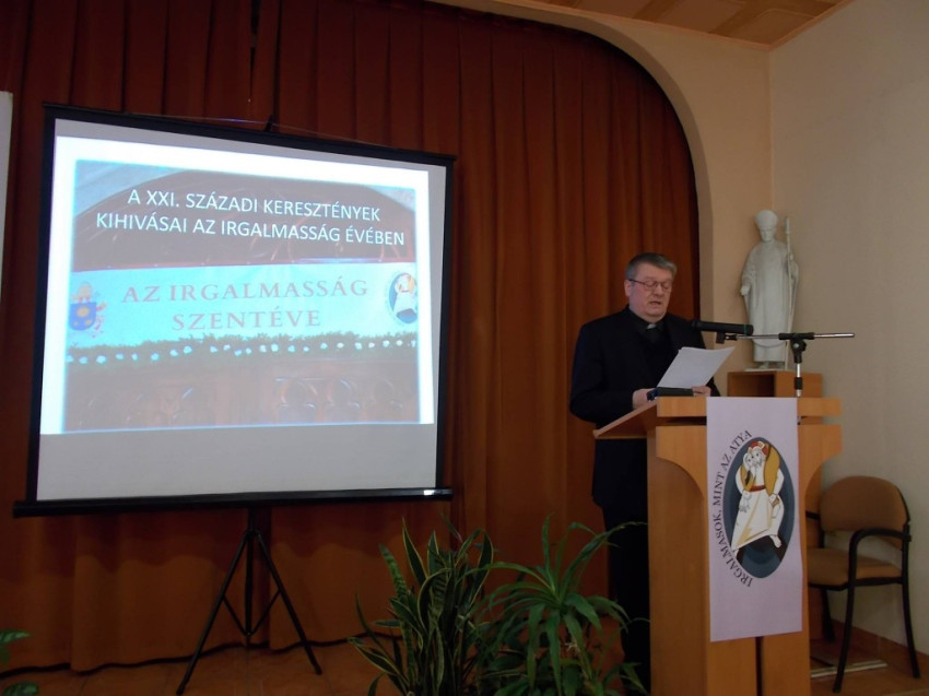 Kovács Sándor főesperes-plébános előadása elején rámutatott, az utolsó fél évszázad pápái számára fontos téma az irgalmasság. Az egyház küldetése, hogy tanúságot tegyen Isten irgalmasságáról – fogalmaz Ferenc pápa. Szent XXIII. János szerint pedig az egyház meg akarja mutatni, hogy mindenkinek jóindulatú édesanyja, akit a tőle elszakított gyerekei iránti irgalmasság és jóság ösztönöz. Az irgalmasság témájában jelent meg Szent II. János Pál pápa Dives in misericordia (Irgalomban gazdag Isten) és XVI. Benedek pápa Deus caritas est (Isten a szeretet) kezdetű enciklikája.