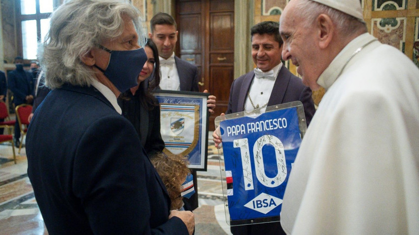 A pápa beszédét megelőzték Massimo Ferrero, a Sampdoria elnöke és Claudio Ranieri, a csapat edzője szavai, akik köszönetet mondtak a pápának a vatikáni találkozóért. A csapat Ferenc pápa felirattal ellátott Sampdoria-mezt és a találkozó emlékére készített zászlót ajándékozott a Szentatyának. A pápa az összes játékost egyenként üdvözölte, majd közös fénykép készült róluk.