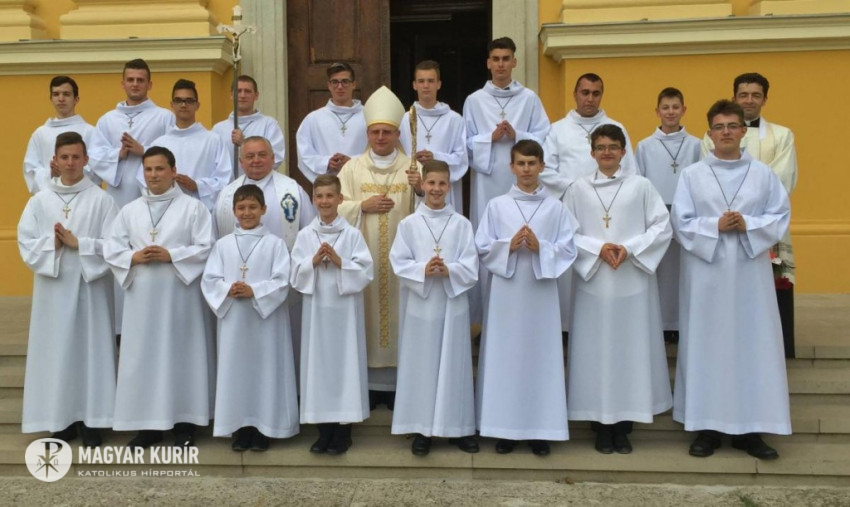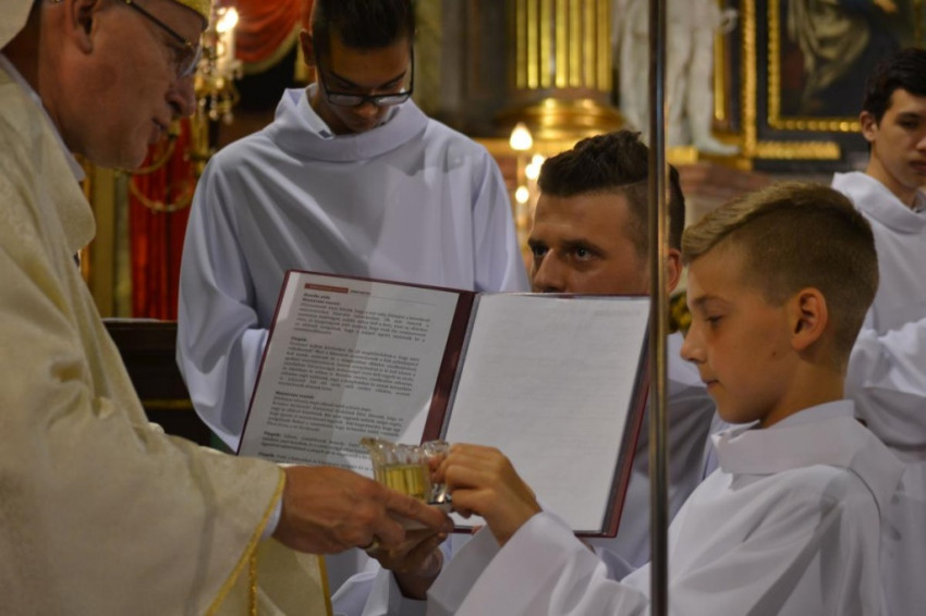 A ministránsjelöltek egyenként vonultak a főpásztor elé, aki kezükbe adva a szentmisében használt kancsókat, illetve a csengőt, hivatalosan is megbízta őket az oltárszolgálattal.