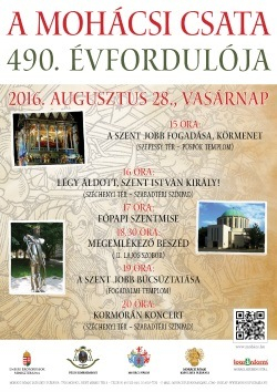 Idén 490 éve annak, hogy Mohácsnál az Oszmán Birodalom legyőzte a keresztény magyarokat. Az 1526-os mohácsi csatáról, Magyarország történelmének egyik legmeghatározóbb eseményéről augusztus végén Mohácson háromnapos rendezvényen emlékeznek meg. A Magyar Katolikus Egyház, a Pécsi Egyházmegye Mohácsi Római Katolikus Plébániája, Mohács Város Önkormányzata, valamint a Duna-Dráva Nemzeti Park Igazgatósága közösen szervezi azt a programsorozatot, amelynek keretében augusztus 28-án, vasárnap Mohácsra érkezik a Szent Jobb.