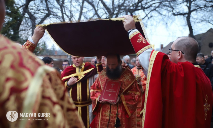 Ternyák Csaba egri érsek és az asszisztencia a vértanúk piros ruhájában vonult az oltár elé és a földre borulva imádkoztak, kifejezve az Isten szeretete iránti alázatot.