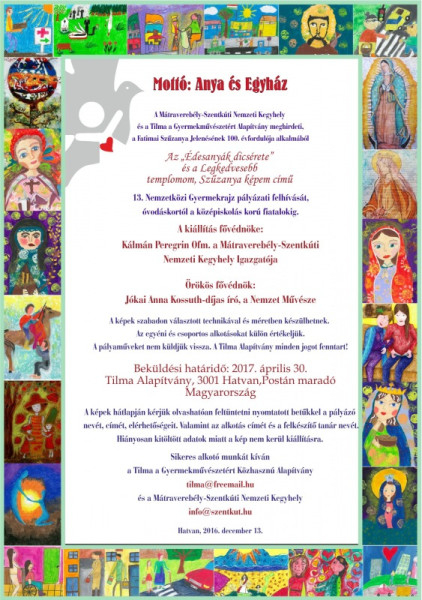 Az idei pályázat az édesanyák és a nagymamák, a nők felé fordítja a fiatal alkotók figyelmét, hiszen az ő életünkben betöltött szerepük, gyengédségük, gondoskodásuk figyelemre és csodálatra méltó. Ehhez hozzátartozik az is, hogy Mária, Jézus édesanyja felé is fordulunk, szemlélve a mátraverebélyi, a máriapócsi, illetve a világ számos Máriát ábrázoló kegyképét. Rajzolhatnak a gyermekek legkedvesebb templomaikról és azokról az élményeikről is, amikor ott boldogok voltak vagy szépséget találtak. Ezzel a pályázat kiírói hangsúlyozni szeretnék: anyánk az Egyház.