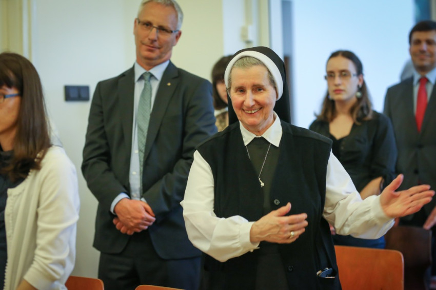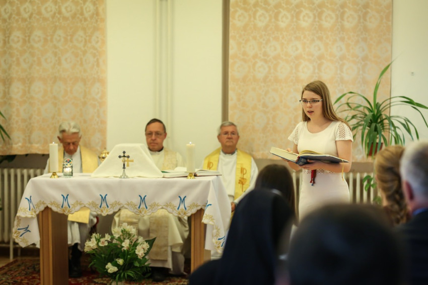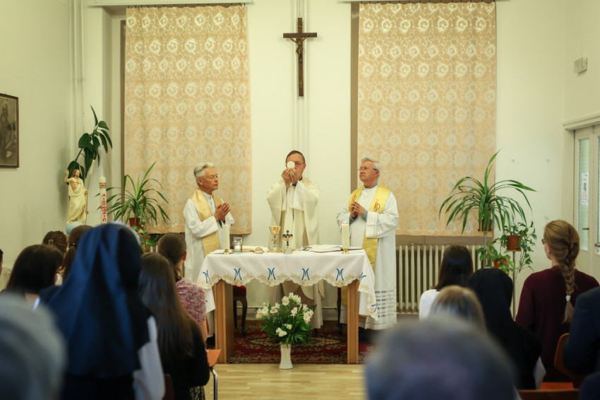 Ezért gyűltek hát össze a szerzetesnők, a diákotthon lakói és a munkatársak május másodikán, a Sasvár utcai házban, hálaadó szentmisére, melynek főcelebránsa Pákozdi István egyetemi lelkész volt. Vele együtt mutatta be a szentmiseáldozatot a ház közvetlen szomszédságában található Krisztus Király-plébánia plébánosa, Nagy Zoltán, valamint Tomka Ferenc atya. Az ünnepi szentmisén részt vett Soltész Miklós államtitkár is.