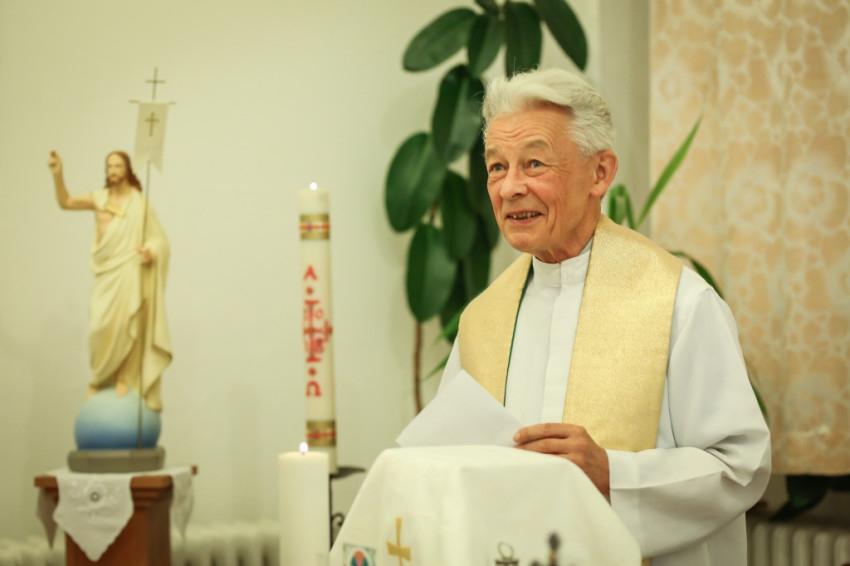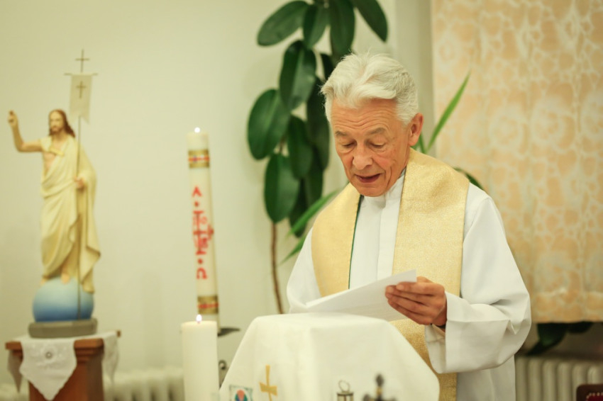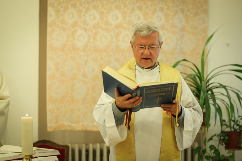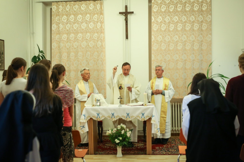 A szertartás előtt nagy volt a sürgés-forgás az épületben. Az apró kápolna nem tudott volna ennyi embert befogadni, ezért egy nagyobb termet rendeztek be „ideiglenesen kápolnának”. A Mária-intézet e célra átalakított helyisége jelezte: ez valóban otthona a diákoknak. Oldalt könyvespolcon sorakoztak a könyvek, egy asztalon számítógép, a fal mellett hűtőszekrények álltak. Szemmel láthatóan egy közösségi termet kellett a szentmise helyszínévé alakítani, hogy harmóniumnak, oltárnak, a szentmise résztvevőinek helyet biztosítson.
