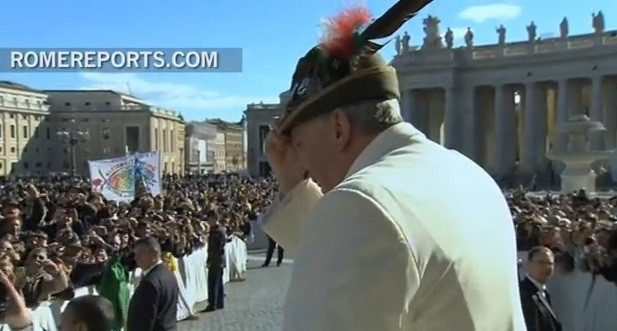 Ferenc pápa köszöntötte az olasz hegyivadász egyesület tagjait, akikkel közös fénykép is készült, amelyen a Szentatya fején viseli hagyományos zöld színű tollas kalapjukat.
