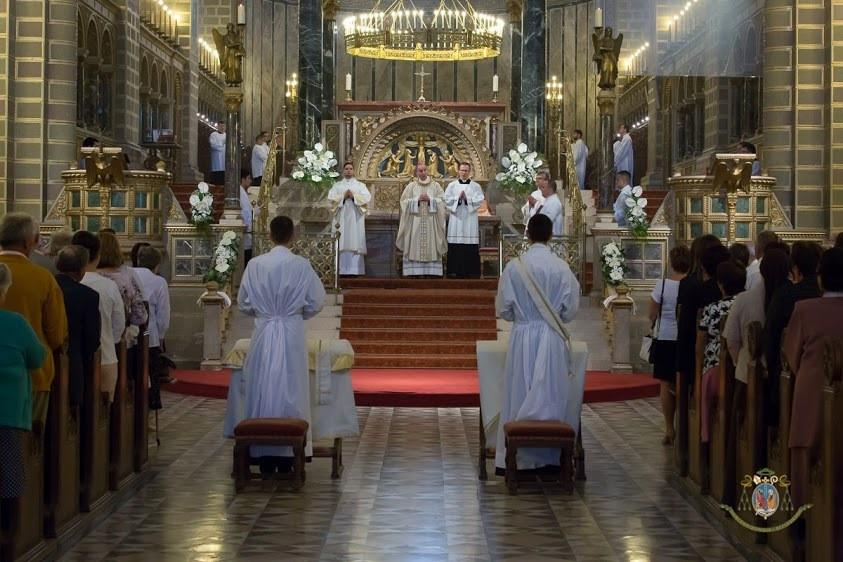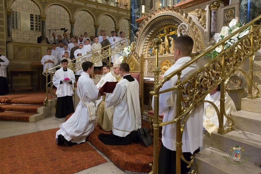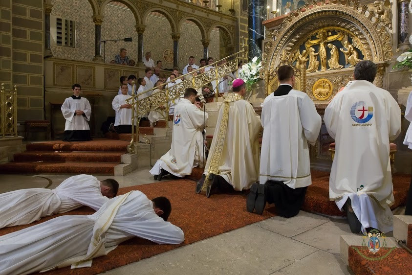 A szentbeszéd után a szentelendők arcra borultak a mindenszentek litániája alatt. A szentelés szertartásában a beöltözés után a megyéspüspök Fekete Zoltánt diakónussá, Sas Norbertet áldozópappá szentelte. Őt a jelenlévő papság minden tagja kézrátétellel fogadta a hagyományok szerint, majd első újmisés áldását a főpásztor kérte.