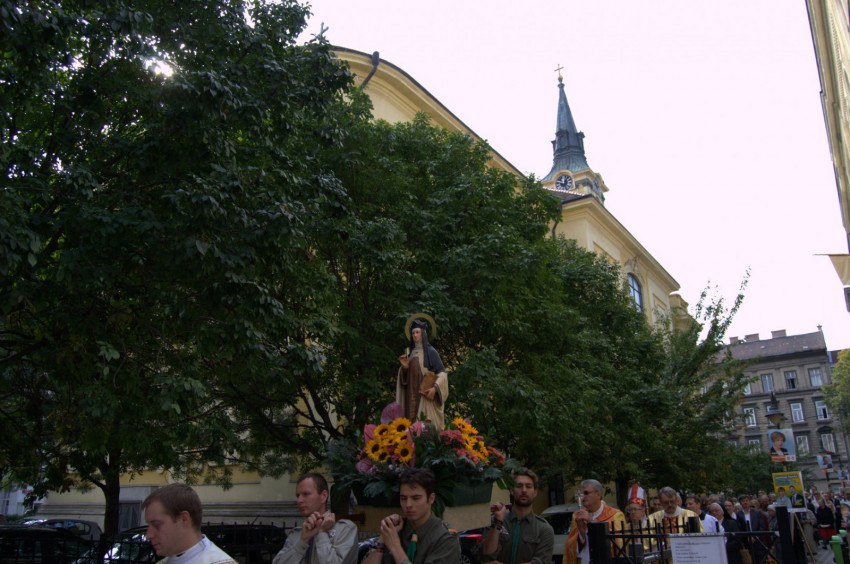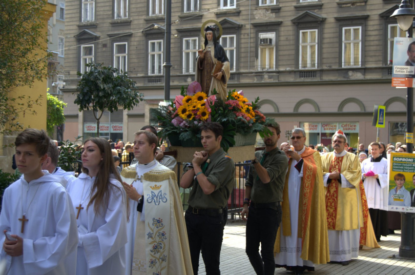 A virágokkal díszített Szent Teréz-szobor mögött Horváth Zoltán István protonotárius kanonok, esperes, a terézvárosi Avilai Szent Teréz-templom plébánosa Szent Teréz csontereklyéjével kért áldást a hívekre.