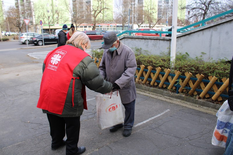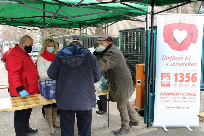 Écsy Gábor, a Katolikus Karitász országos igazgatója elmondta, két helyszínen összesen háromszáz adag tarhonyás húst és csemegeuborkát, valamint kenyeret osztottak most szét, ügyelve az egészségügyi előírásokra. Az ételeket biztonságos módon, előre dobozolva szállították a helyszínre.