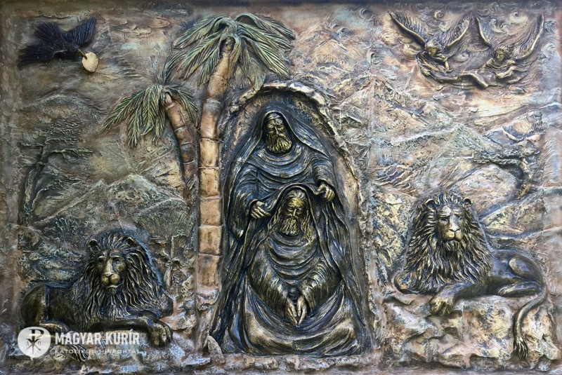 A szentmise után Borsos József márianosztrai pálos szerzetes megáldotta Varga Gábor szobrászművész alkotását, a Remete Szent Pált és Remete Szent Antalt ábrázoló domborművet. Az alkotás azt a jelenetet ábrázolja Remete Szent Pál életéből, amikor Szent Antal – miután kérésére elhozta Pálnak Szent Atanáz köpenyét – visszaérkezve holtan találja meg őt. Pál imádsága közben hazatért Teremtőjéhez. A domborműn látható pálmafa, a holló, csőrében cipóval és az oroszlánok Remete Szent Pál attribútumai, melyek a pálos rend címerében is megtalálhatók.