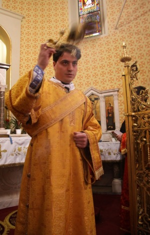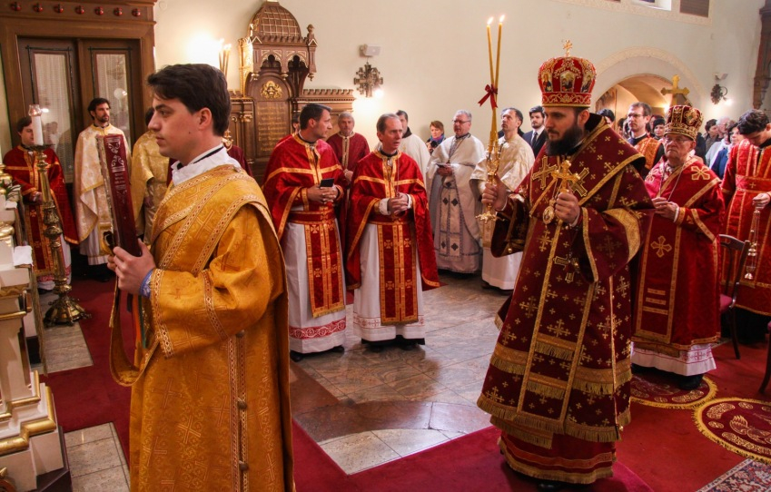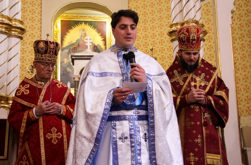 A Szent Liturgiát még diakónusként kezdő Szirmai Máté füstölővel fogadta a szentelésére érkező Szocska Ábel és Keresztes Szilárd püspököket gyerekkora templomában.