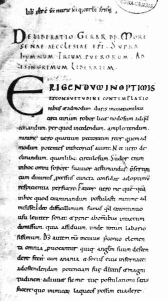 A 11. században született írás, Gellért püspök Deliberatio Gerardi Moresauae aecclesiae episcopi supra Hymnum trium puerorum ad Isingrimum liberalem (A marosi egyház püspökének, Gellértnek értekezése a három ifjú énekéről a tudós Isingrimusnak) című hittudományi értekezése a magyarországi latin nyelvű irodalom legrégibb maradványa Szent István király intelmei mellett.