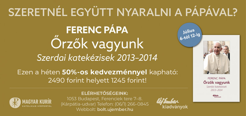 Ferenc pápa Örzők vagyunk – Szerdai katekézisek 2013-2014 című kötete kedvezményes áron megvásárolható az Új Ember könyvesboltban (Budapest, V. kerület, Ferenciek tere 7–8. Nyitvatartás: hétfő, kedd, csütörtök, péntek: 9–17 óráig; szerdán 10–18 óráig) vagy megrendelhető az Új Ember online könyváruházban.