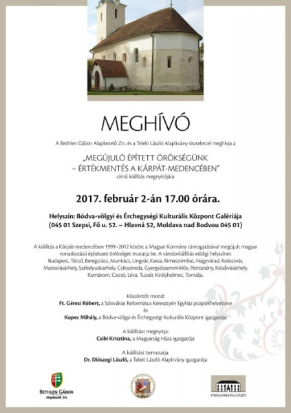 A Bethlen Gábor Alapkezelő Zrt. és a Teleki László Alapítvány közös tárlata az 1999–2012 között, a magyar kormány támogatásával megújult külhoni magyar műemléki felújítások eredményeiről számol be. A kiállítás a Bódva-völgyi és Érchegységi Kulturális Központ Galériájában látható.