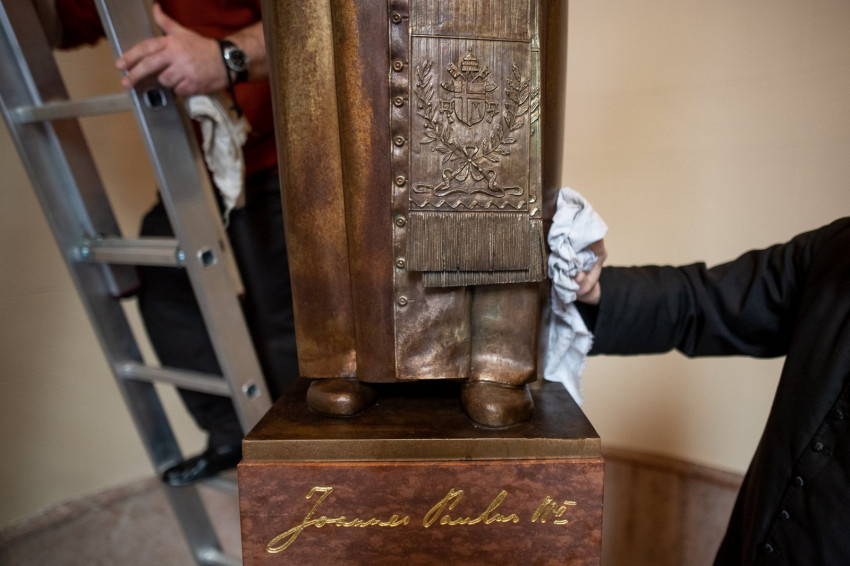 Snell György esztergom-budapesti segédpüspök, a Szent István-bazilika plébánosa hétfőn, május 18-án reggel a hét órakor kezdődő szentmise keretében áldotta meg Szent II. János Pál pápának a főtemplom papi bejárójánál felállított életnagyságú szobrát, Kotormán László és testvére, a Munkácsy-díjas Kotormán Norbert szobrászművész alkotását – írja az Esztergom-Budapesti Főegyházmegye Facebook-oldala.