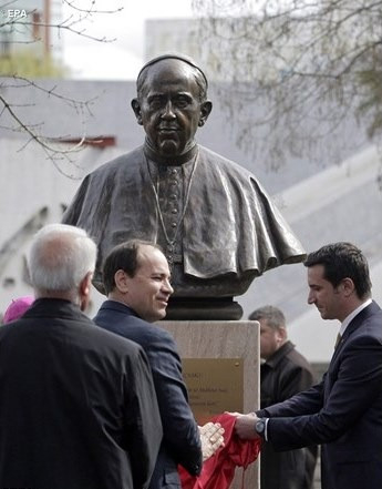 Ferenc pápa mellszobra az úgynevezett „piramis” mellett áll Tirana szívében. Az épületet a kommunista rezsim idején emelték az elhunyt diktátor, Enver Hodzsa tiszteletére. Ő volt az, aki a ’60-as évek végén bevezette Albániában az állami ateizmust, és megtiltott minden vallásgyakorlást.