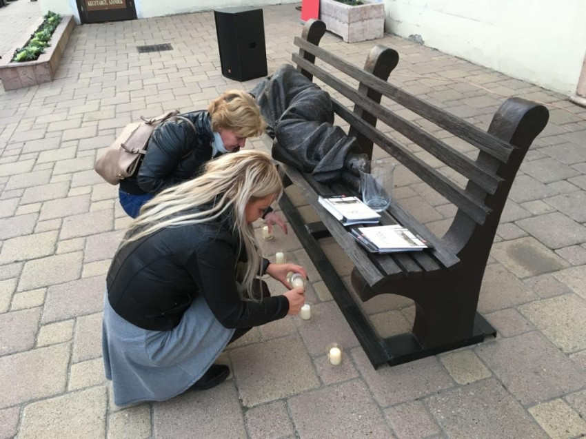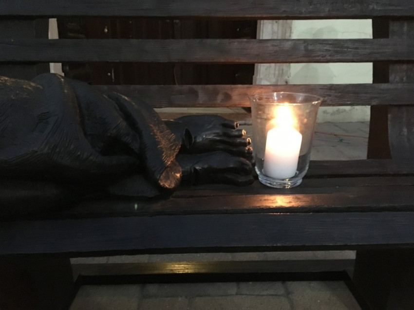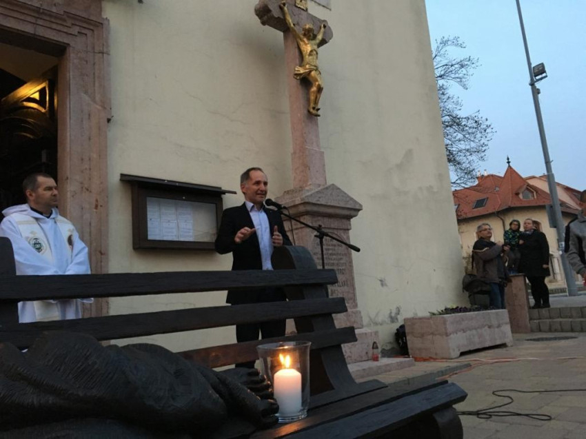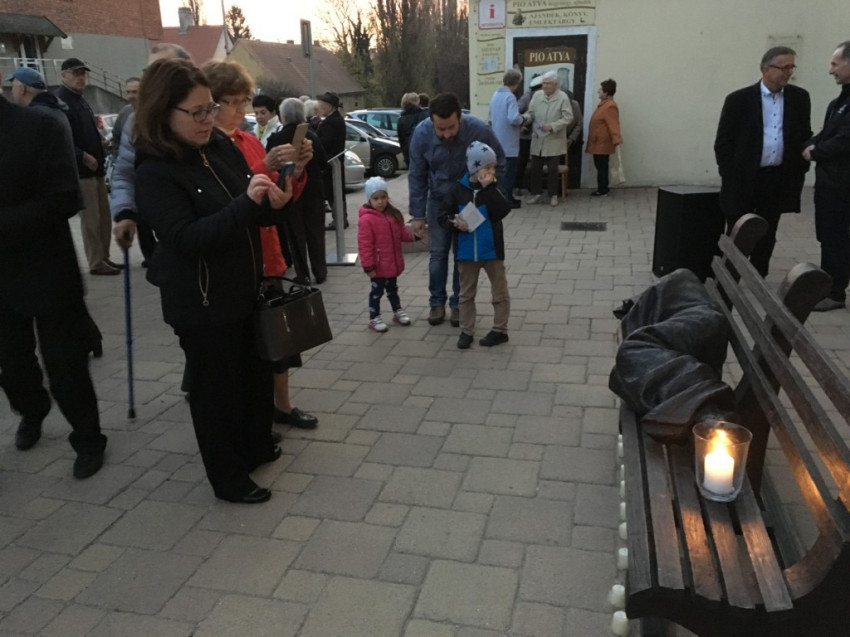 A Geszti Óvódába járó gyerekek műsora után Vecsei Miklós, a szeretetszolgálat alelnöke mondott beszédet. Felidézte orvosokkal kapcsolatos élményeit, akik odafeküdtek a betegeik mellé. „Fölvették azt a pózt, amit a náluk gyengébbek. Az embert az élet különféleképpen tudja »kiütni és földre küldeni«, és aki kívülről nézi, nem tudja, mi az oka, hogy valaki gyenge, nevetséges vagy szánalmas lett. Sokszor látjuk ezt a hajléktalan emberek életében is. Távolról nézzük őket, kicsit gyanakszunk, félünk, vagy egy jó prédikáció után meg is könnyezzük őket a koldus Lázár történetében. De a templom előtt az a hajléktalan ember koszos és ijesztő. Ez a szobor ezért fekszik itt. Felteszi a kérdést, hogy meglátjuk-e a drogosban, az alkoholistában Krisztust, és azt is meg kell válaszolnunk, hogy mi közünk a názáreti Jézushoz. Ezt mindenkinek személyesen meg kell válaszolnia. Ennél többet nem tehetünk. Működhet a világ jól vagy rosszul, de amit irányítani tudok, az, hogy én jól működöm-e.”