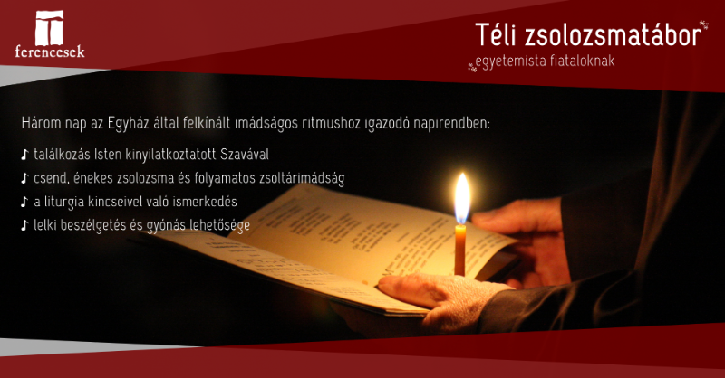 – A táborba elsősorban egyetemistákat várunk, nem véletlenül időzítettük a tábort a téli vizsgaidőszak végére. Meghívtam még azon érdeklődő fiatalokat is, akik a korábbiakban már felvették a kapcsolatot rendünkkel, és gondolkodnak azon, hogy a ferences hivatást válasszák. A tábor nem titkolt szándéka, hogy lehetőséget biztosítson az elcsendesedésre azok számára is, akik a hivatásukat keresik. A zsolozsmaimádság felkelthet bennük olyan hangokat, amelyek segítik saját hivatásuk kibontakoztatását, tisztázását. Jelentkezni az erre kialakított űrlapon lehet, amely megtalálható a rend honlapján és a Facebookon létrehozott esemény leírásában is.