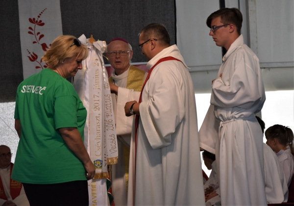 A szentmise végén az egyházmegyei találkozó vándorzászlajára felkötötték a szalagot és kihirdették, hogy jövő júniusban az egyházmegyei találkozó Vácon, az alsóvárosi plébánia szervezésében lesz megtartva. A szentmisén a környező települések kórusaiból összeállított vegyeskar végzett zenei szolgálatot Acsainé Dávid Ágnes vezényletével.