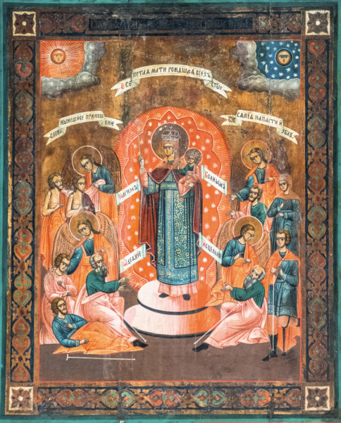Ez az orosz ikon a 17. században készült. Középen az Istenszülő, bal karján a gyermek Jézussal, míg jobb keze királyi jogart tart, fején pedig királynői koronát visel. Fölötte, a magasban az áldást osztó Seregek Ura; jobbján a Nap, balján a Hold, azaz az egész világmindenség. Az Istenszülő körül ott vannak a betegek és a szenvedők, akik az ő közbenjárása révén nyernek gyógyulást és segítséget az angyaloktól. Az ikon közepén, a mondatszalagon ez a könyörgés olvasható: „Szent Anyánk, kit a szüntelen ének illet, ki az összes szentek legszentebb Igéjét szülted.” Az alatta lévő két szalagon, balra és jobbra, az alábbi szavak olvashatók: