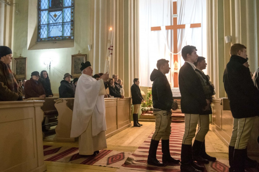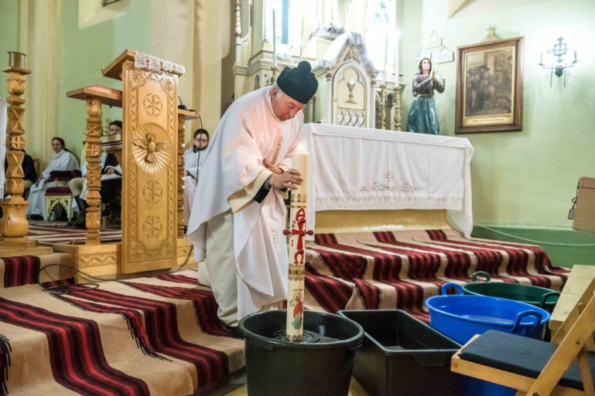 Gábor Zoltán csíkszépvízi plébános a megszentelt gyertyával megszentelte a vizet a nagyszombati mise kezdetén az erdélyi csíkszépvízi Szent László katolikus templomban 2018. március 31-én. A megszentelt vízből a hívek másnap vihetnek haza.