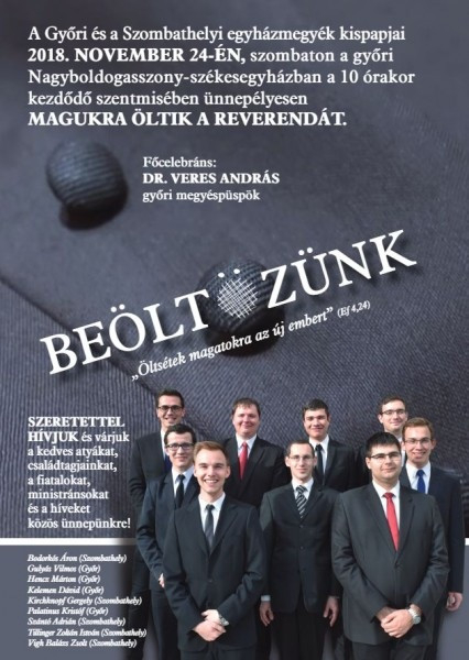A szombati ünnepen a Győri Hittudományi Főiskola és Papnevelő Intézetben tanuló Bodorkós Áron (Szombathely), Gulyás Vilmos (Győr), Hencz Márton (Győr), Kelemen Dávid (Győr), Kirchknopf Gergely (Szombathely), Palatinus Kristóf (Győr), Szántó Adrián (Szombathely), Tillinger Zoltán István (Szombathely) és Vigh Balázs Zsolt (Szombathely) öltöznek be. A szentmise főcelebránsa Veres András győri megyéspüspök lesz.