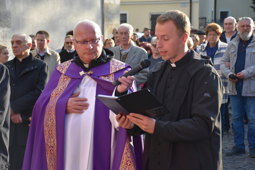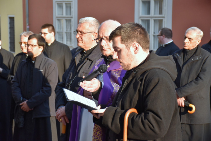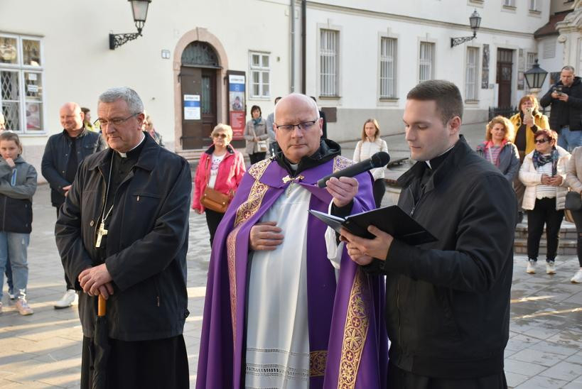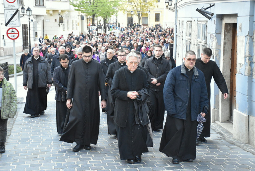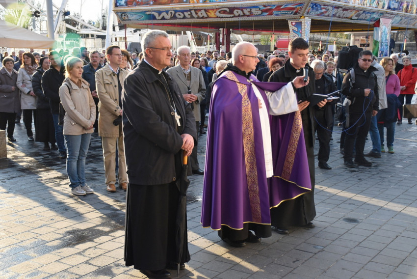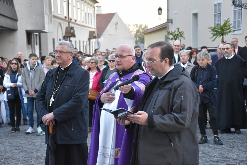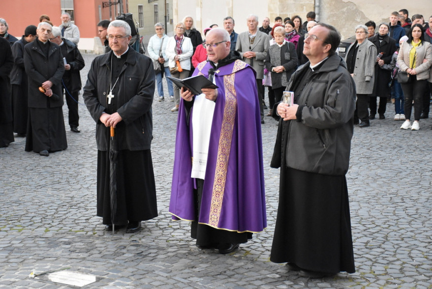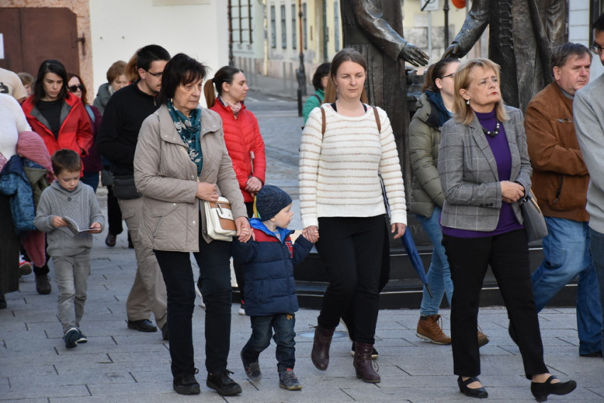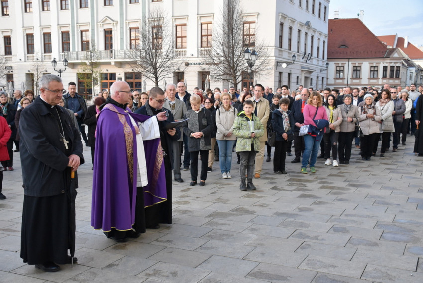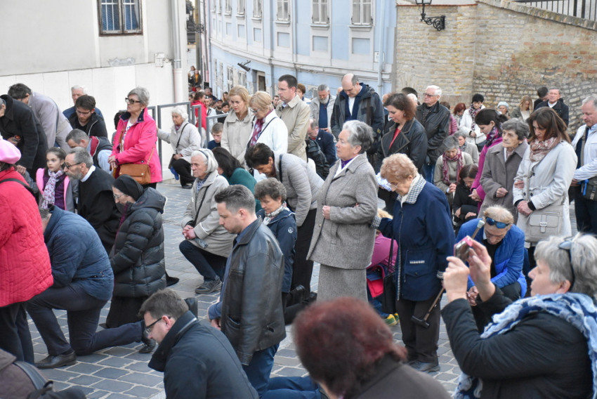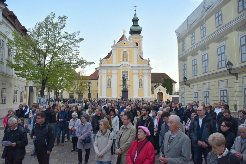 A keresztútjárás előtt fél órával még sötét felhők borították be az eget a győri Nagyboldogasszony-székesegyház felett. Ám hat órakor már kellemes, esti napsütésben indulhatott a közös imádság, amelyet Reisner Ferenc általános püspöki helynök vezetett. Több mint félezren vettek részt rajta. Az imádságok és az énekek tanúságtételként hatottak a zsúfolt belvárosban.