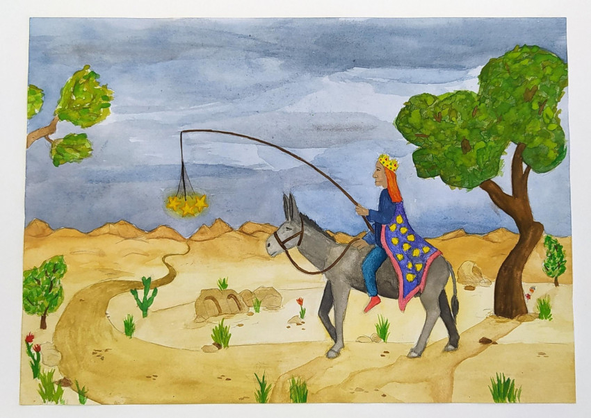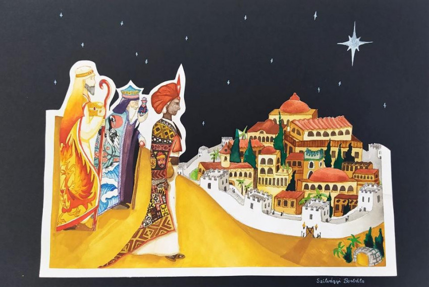 Az első, a Háromkirályok témájában hagyománykövető, nyelvi, képi játékosságával friss, inspiráló költemény. Ez a színes, könnyed játék a gyerekek rajzain is tükröződik. Pompázatos színekben, fantasztikus ruhákban ábrázolják a királyokat.