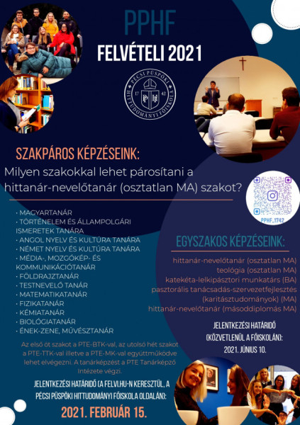 Jelentkezés: a felvi.hu oldalon keresztül, a Pécsi Püspöki Hittudományi Főiskola oldalán.