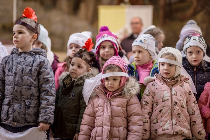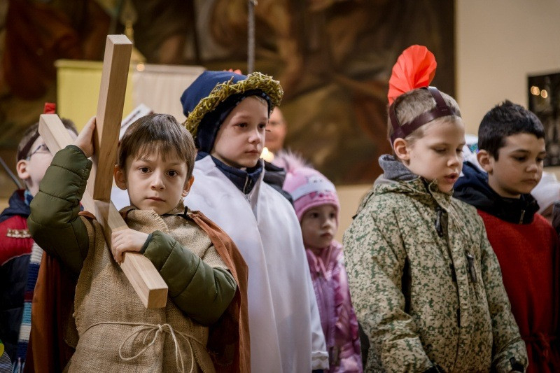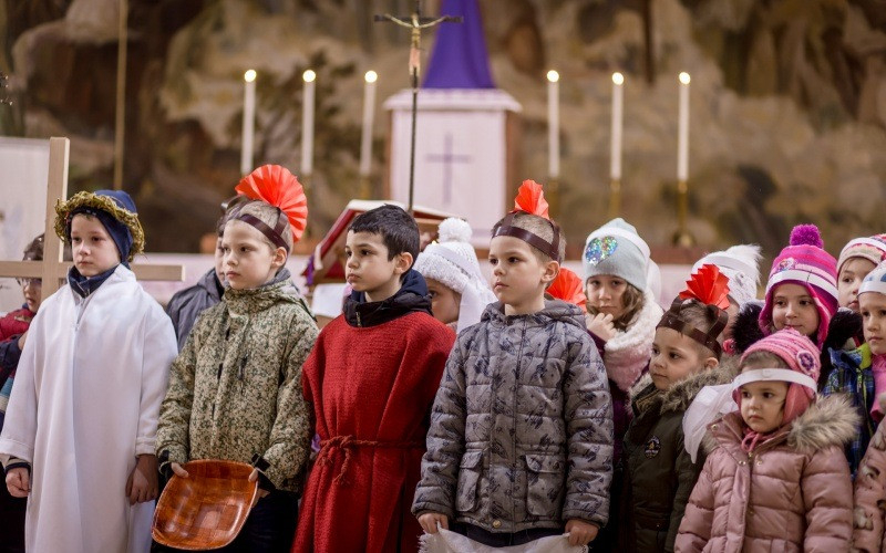A stációkat gyerekszereplők jelenítették meg, az elmélkedéseket a szülők olvasták fel. A keresztutat vezető Spányi Antal püspököt, valamint Tóth Tamás plébánost és a részt vevő szülőket, gyermekeket Ugrits Tamás pasztorális helynök, iskolabiztos köszöntötte.