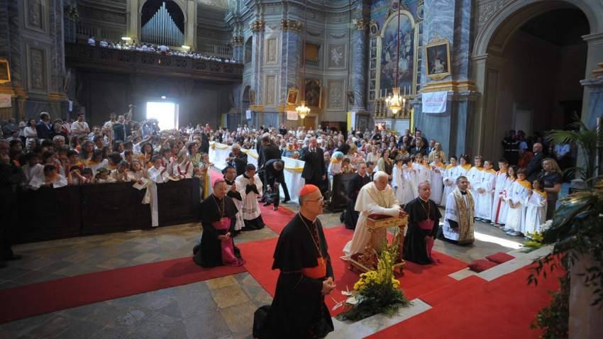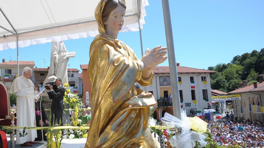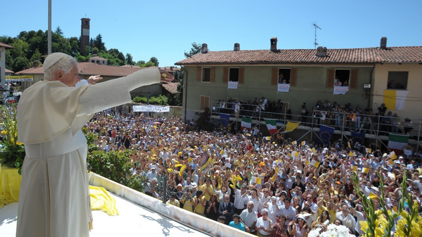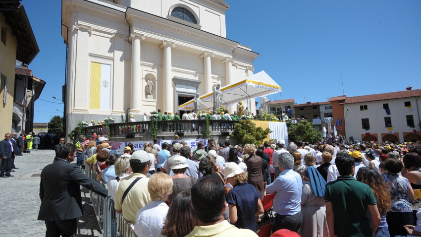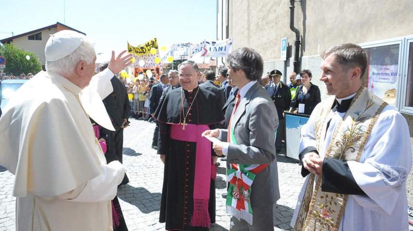 A tíz évvel ezelőtt látogatás emlékére Tarcisio Bertone szentmisét mutatott be a piemonti faluban. Homíliájában az emeritus pápát az imádság példaképének nevezte: Isten embere, aki elmélkedéssel és buzgó imával tölti napjait, így kíséri az Egyház és utóda, Ferenc pápa útját.