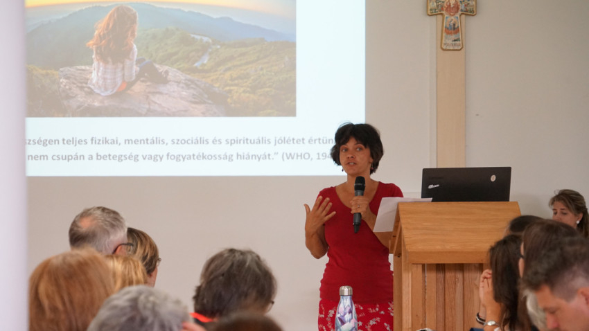 A szentmise után két szakmai előadás következett. A kiégés elméleteit, annak folyamatát és a veszélyeztető tényezőket Somosiné Tésenyi Tímea, a Semmelweis Egyetem Mentálhigiéné Intézetének adjunktusa foglalta össze, Miért nincs jól, aki mindig jó? Testi-lelki egészségünk megőrzése a segítő szakmában címmel. „Aki mindig csak ad, és nem töltekezik, annak egy idő után leapad a belső energiaszintje. Ilyenkor például lebetegszünk, panaszkodunk vagy mártírszerepbe helyezzük magunkat. A lelki egészséget működtető elemek egyaránt tevődnek össze személyiségfaktorokból, környezeti és az azon túli, spirituális tényezőkből: az egészség a folyamatok egyensúlya” – hangsúlyozta az előadó.