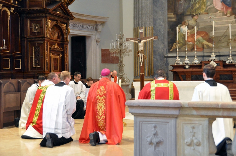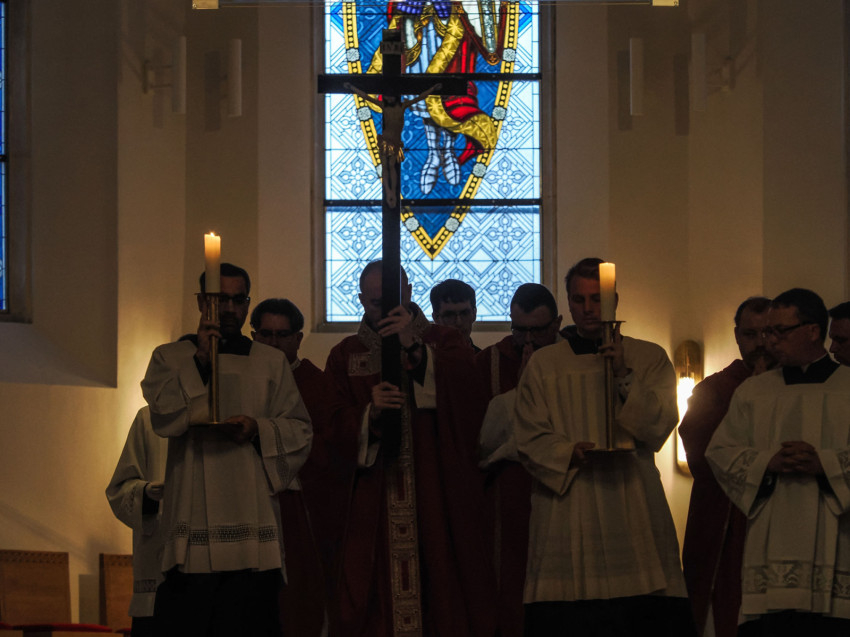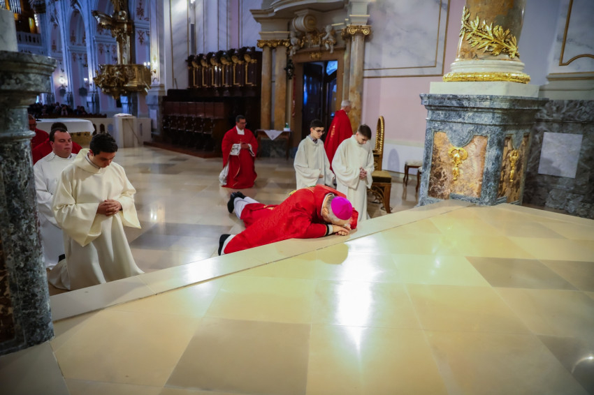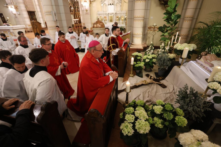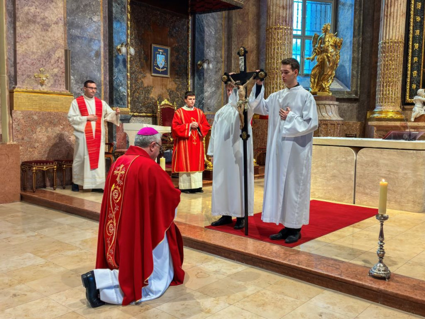 Az ősi hagyomány szerint a Jézust jelképező oltár díszek nélkül, lecsupaszítva állt a Szent Imre-templomban. A főpásztor és a ministránsok csendben vonultak be a templomba, majd a püspök leborult az oltár, az önmagát kiüresítő Krisztus jelképe előtt.