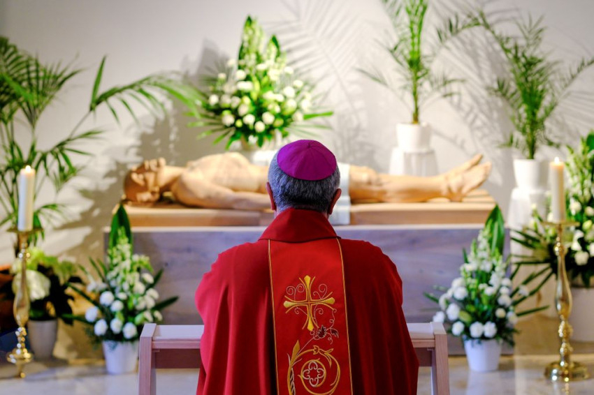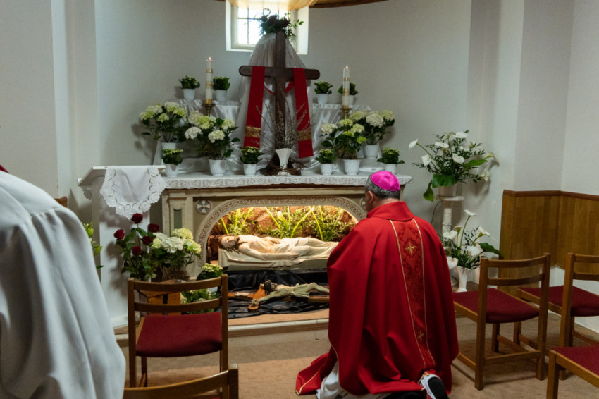 A főpásztor a szertartás zárásaként az Örökimádás kápolnában felállított Szent sír előtt imádkozott.