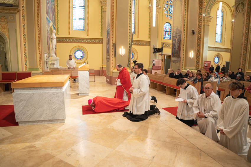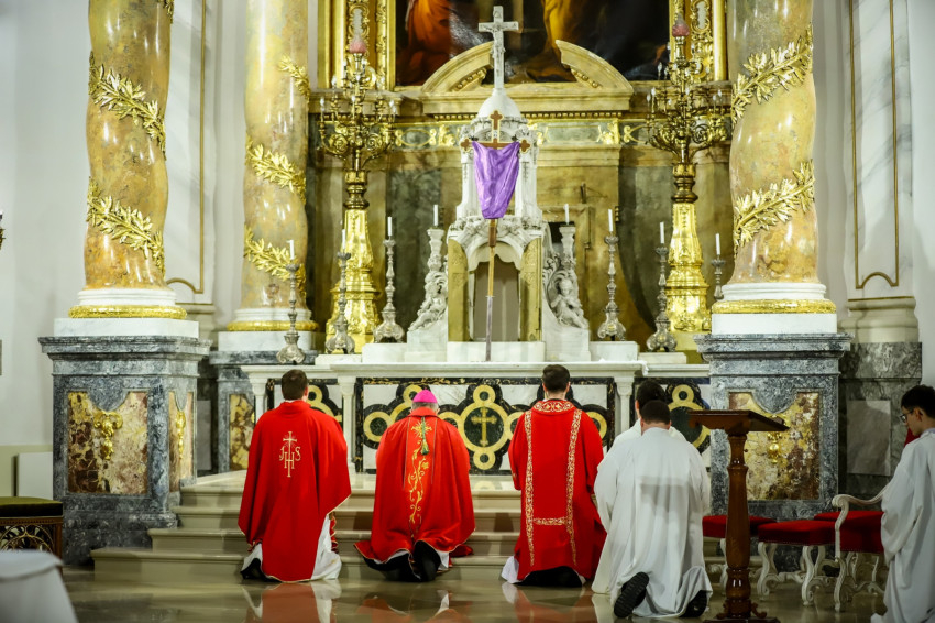 Jézus Krisztus kínszenvedésének, kereszthalálának és sírba tételének napján Varga László kaposvári megyéspüspök vezetett nagypénteki szertartást a Nagyboldogasszony-székesegyházban. A liturgia elején a főpásztor, Varga Péter plébános és az asszisztencia csendben vonult az oltárhoz, majd a megyéspüspök leborult előtte, megjelenítve az önmagát kiüresítő, emberrel azonosuló Krisztust.