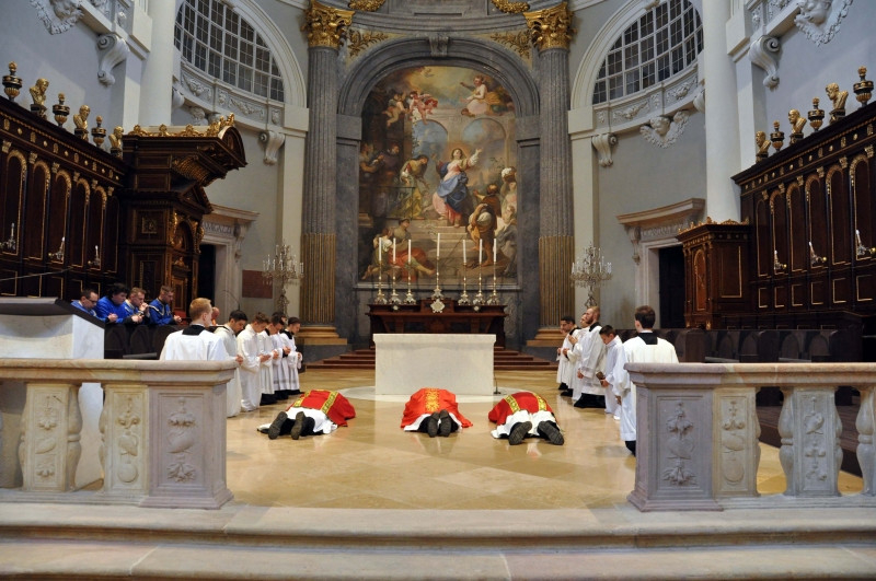 Nagypénteken az egri bazilikában tartott szertartás kezdetén csendes bevonulást követően a vértanúkra utaló piros miseruhában Ternyák Csaba érsek az asszisztenciával együtt az önátadás jelenként leborulva imádkozott az oltár előtt.