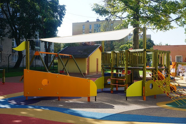 Színesek nemcsak a játékok, hanem a terület egy részét borító gumiburkolat is. A játszóudvar többfunkciós: a gyermekek változatos fejlesztését teszi lehetővé a szabadban. A sokoldalú mozgásformák végzése mellett a kerti ülőkék és füves részek más jellegű foglalkozások szervezésére is alkalmas teret biztosítanak, a tankert ismeretek szerzését teszi lehetővé, sőt a városi gyermekek számára szokatlan élményt biztosít az úgynevezett mezítlábas tanösvény.