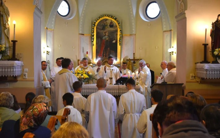 Hasonló gondolatokat fogalmazott meg a templom megáldása és megszentelése előtt Schönberger Jenő szatmári megyéspüspök, aki ezen az esős, de gyönyörű szép vasárnapon hálás szeretettel kérte Isten áldását mindazokra, akik adományaikkal és munkájukkal támogatták a felújításokat, majd örömmel köszöntötte az ünnepségen részt vevő Tuomo T. Vimparit, a bukaresti nunciatúra ügyvivőjét, a környék- és megyebeli római katolikus plébánosokat, akik mellett az Ugocsára jellemző hagyományok szellemében Elek Arnold Zoltán halmi református lelkipásztor is részt vett.