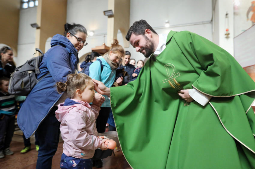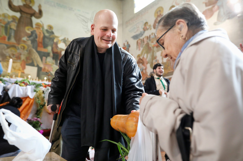 A liturgia végén a templomban, ahol gyakorlatilag minden egy hatalmas térben van, hiszen a három hajó csak jelképes, megkezdődött a láthatóan friss zöldségek és gyümölcsök szétosztása. Kettes sorokban érkeztek a hívek az oltár asztalához, ahol a cserkészek és a ministránsok kiosztották a kiporciózott terményeket. Jól tették Béla atyáék, hogy sokat vásároltak, így jutott mindenkinek, akik sorba álltak érte.