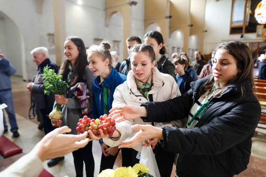 A megáldott zöldséget, gyümölcsöt bezacskózzuk, és a ministránsok kiosztják a híveknek. Így az embereket hálaadásra serkentjük.