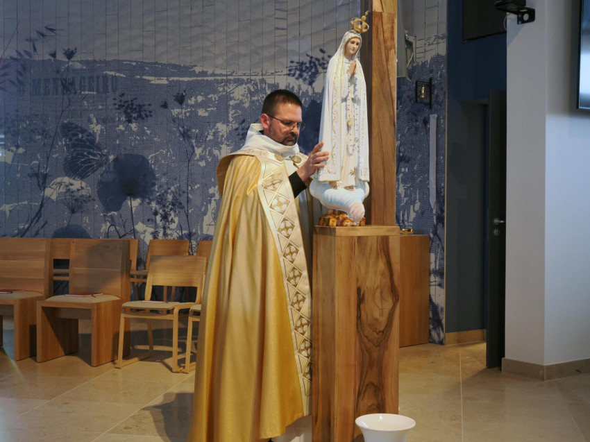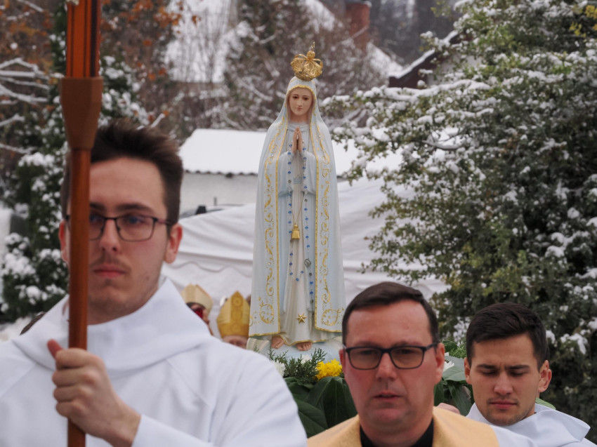 Az ünnepi liturgia a nemesvámosi Fatima-házban kezdődött, ahonnan körmenetben vitték az új templomba a Fatimából hozott Szűz Mária-szobrot.