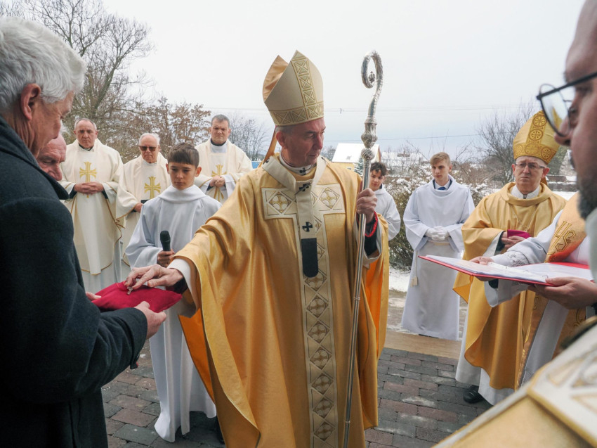 A főpásztor ünnepélyesen átadta az épület kulcsait Gere Dávid Márk SMC plébánosnak, aki kitárta az új templom ajtaját.