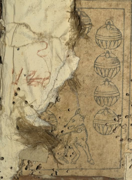 A sérülés mentén láthatóvá vált részen egy 16. századi játékkártyát sikerült a könyvtárasoknak beazonosítaniuk. Ez a Karnöffel elnevezésű, a 15. század elején Nördlingenben felbukkant, és később a teljes német nyelvterületen meghonosodott, rendkívül népszerűvé vált kártyajáték egy lapja, amit nem használtak; egy soha ki nem vágott és soha ki nem színezett darab.