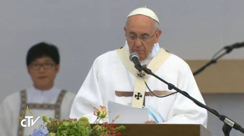 „A vértanúk dicsősége ragyog rátok!” – kezdte szentbeszédét a pápa, utalva az ifjúsági találkozó témájára. – „Ezek a szavak mindnyájunknak vigaszt nyújtanak, és megerősítenek bennünket. Ázsia fiataljai: nagy tanúságtétel, egy Krisztusba vetett értékes hitvallás örökösei vagytok. Ő a világ világossága, ő a mi életünk világossága. A koreai vértanúk – és a számtalan vértanú egész Ázsiában – átadták testüket üldözőiknek; örökös tanúságot tettek nekünk arról, hogy Krisztus világossága eloszlatja a sötétséget. Krisztus szeretete dicsőségesen győzedelmeskedik. A halál felett aratott győzelmének bizonyosságában, amelynek mi is részesei vagyunk, szembe tudunk nézni a keresztény tanítványok mai kihívásaival saját környezetünkben, a mi korunkban.