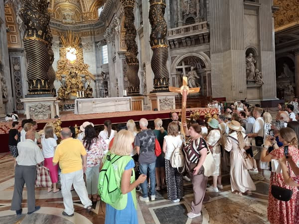 Ma reggel Szent Péter sírjánál találkoztunk, én már a napi vértanú szent piros miseruhájába öltözve várom őket, akik pedig mint egy igazi keresztalja frissen érkeznek a szent kaputól és az óriási bazilikában egymásba és Szent Péterbe kapaszkodnak. A bukdácsoló halászba, ki egy csöppet sem volt jobb, mint a mai kárpátaljaiak. Csak ő éppen hagyta, hogy más övezze fel és oda vigye, ahová nem is akarta, tanúságtétele helyére. Mi pedig éppen ott állunk, ahol Péter szíve dobog, mert él az Egyház és itt magához öleli közeli és távoli gyermekeit.