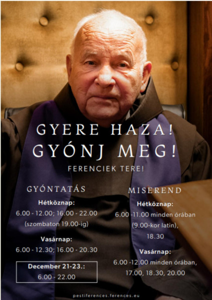 Részletek, gyóntató- és gyóntatásirend-beosztás a https://pestiferences.ferences.eu, illetve a Pesti ferences templom Facebook-oldalon található.